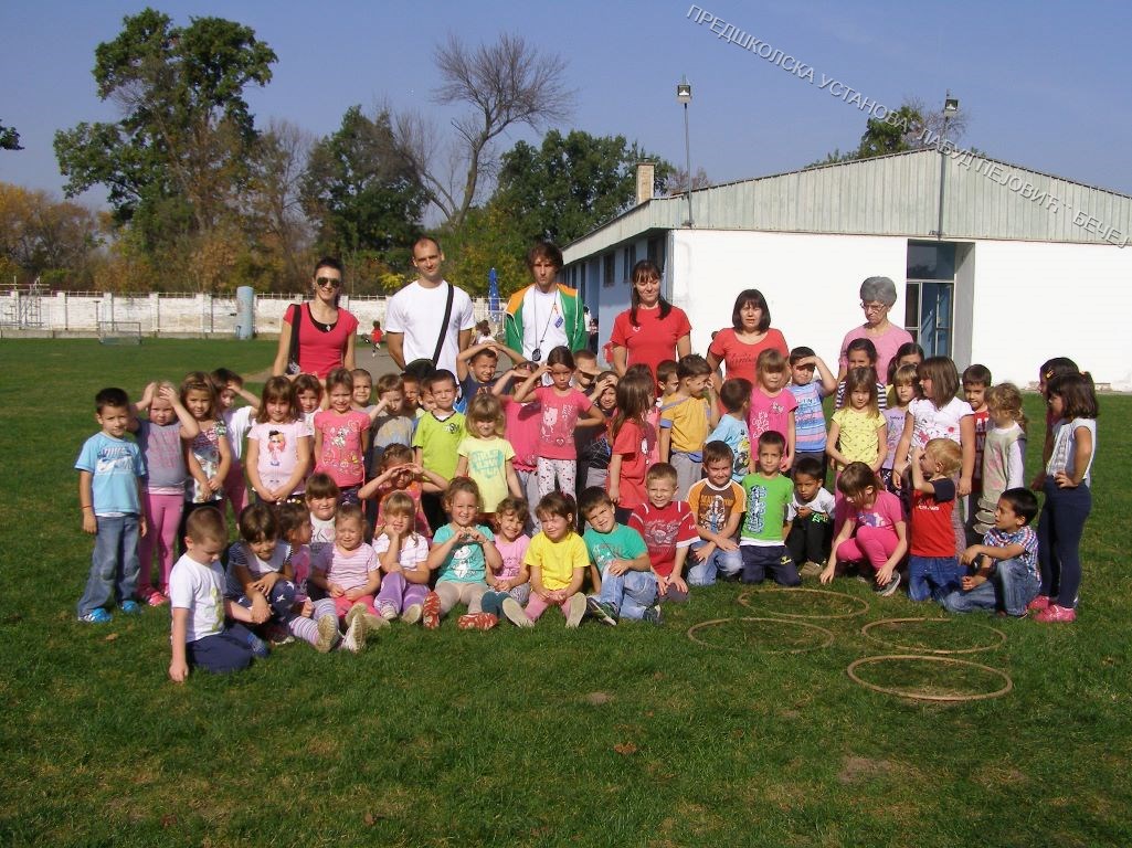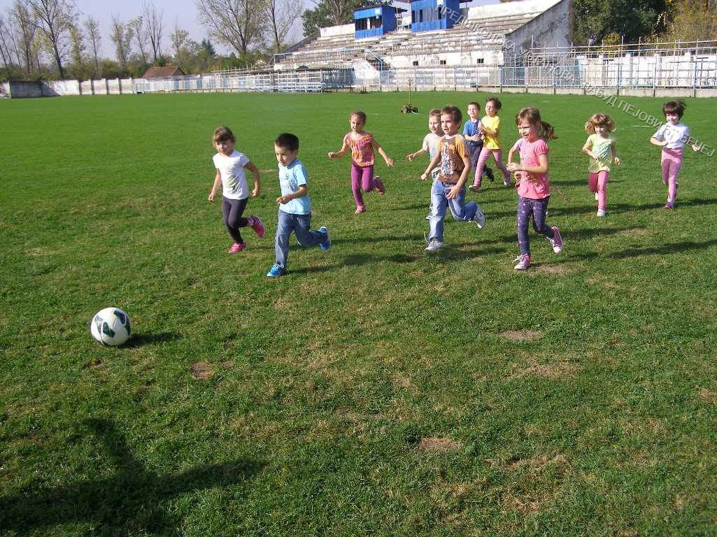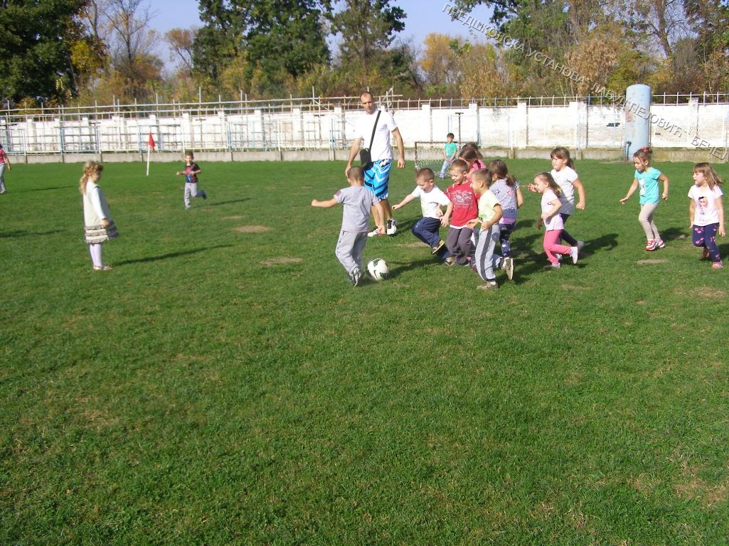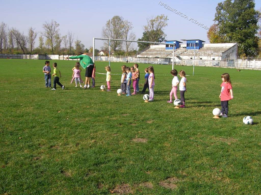 Васпитно-образовне групе из вртића „Колибри „, „Маслачак„, „Дуга„,„Сунчица„и „Бубамара„ су, након обележавања Дечије недеље у октобру 2014. године, отишле на стадион у посету фудбалском клубу. Ову посету су нам заједно организовали тим Спортић из наше установе и Спортски савез општине Бечеј. Тамо смо упознали тренера и кроз игру се упознали са основама игре која се зове фудбал. Деца су данима причала о овој посети а интересовање је било једнако како код дечака тако и код девојчица.