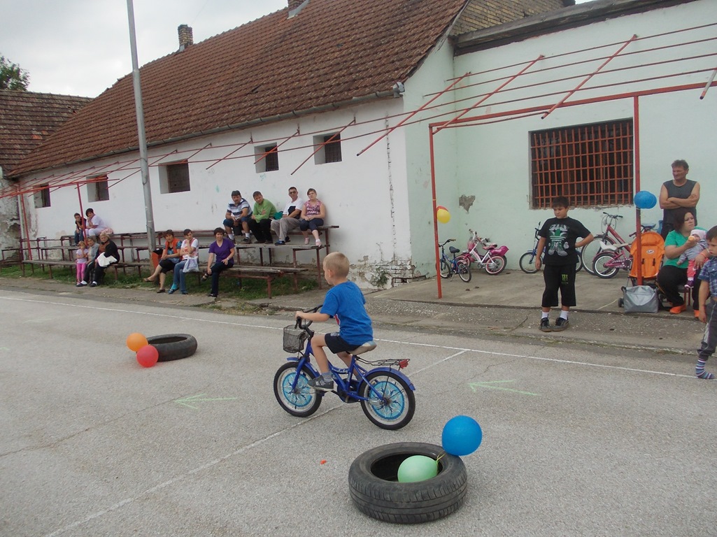 -вожња бициклом по цик-цак линији између препрека – учесници: деца и родитељи