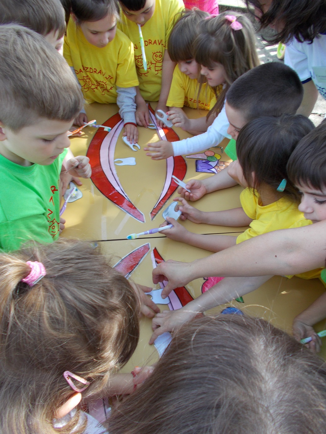- Нега зуба: задатак деце је био да здраве моделе зубића налепе у усну која је јела здраву храну, а покварене зубиће налепе у усну која је јела нездраву храну. Након тога деца су имала прилику да се на моделу зуба упознају о начину правилног одржавања хигијена зуба и усне дупље покретима „киша пада, трава расте“-према горе, према доле. За успешно реализован задатак деца су добила на поклон четкицу за зубе.