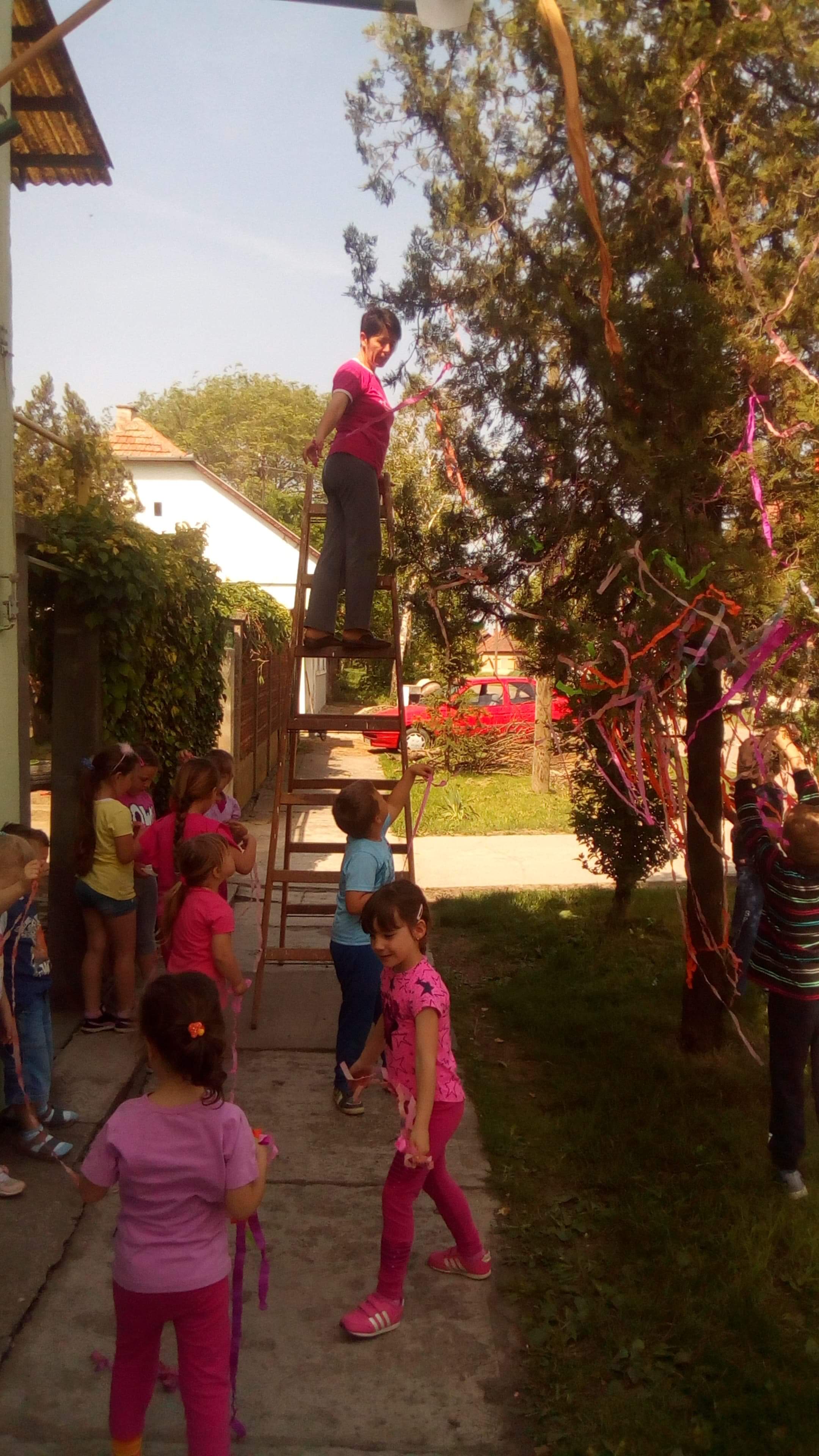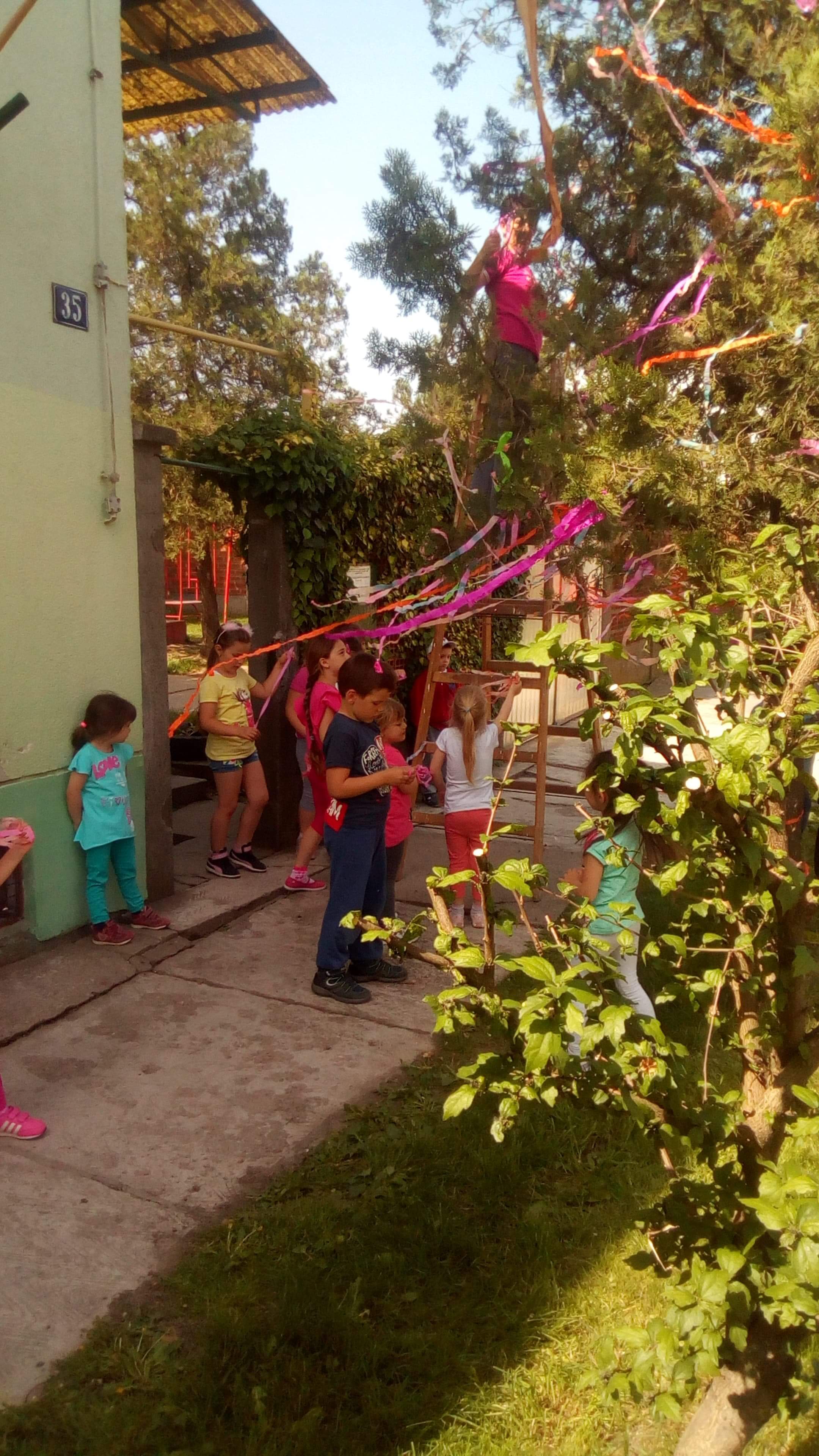 2018.04.30-án Péterrévén a Kelemen óvódában Pál Erzsébet és Rabockai Gyöngyi óvónők közösen a gyerekekkel MÁJUSFÁT díszítettek. A gyerekek az óvónők segítségével különböző színű és hosszúságú szallagokat kötöztek a fa ágaira, amit azután minden arra járó megcsodált.