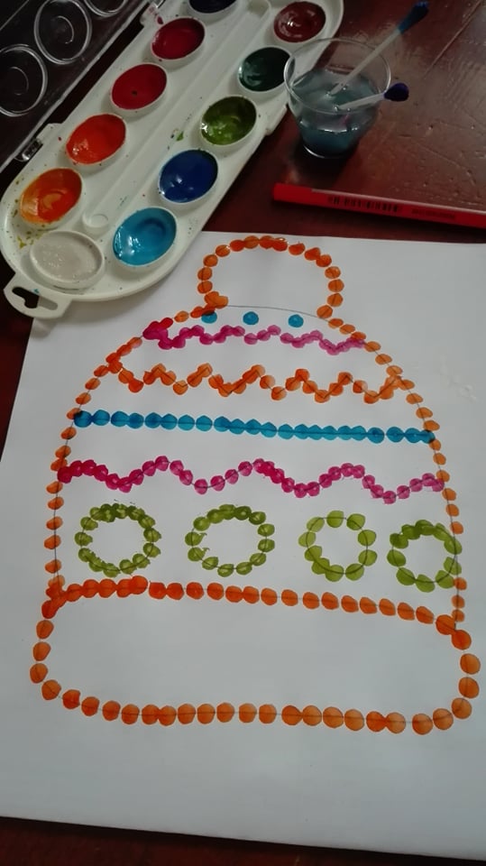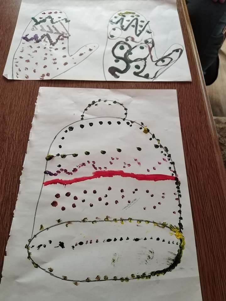 Након ових активности, када је васпитачица увидела колико се свима допада рад са чачкалицама за уши, дала је још један задатак- осликати воденим бојама и чачкалицом за уши контуре капе и рукавица јер им је послала причу под називом Kesztyű (рукавице).