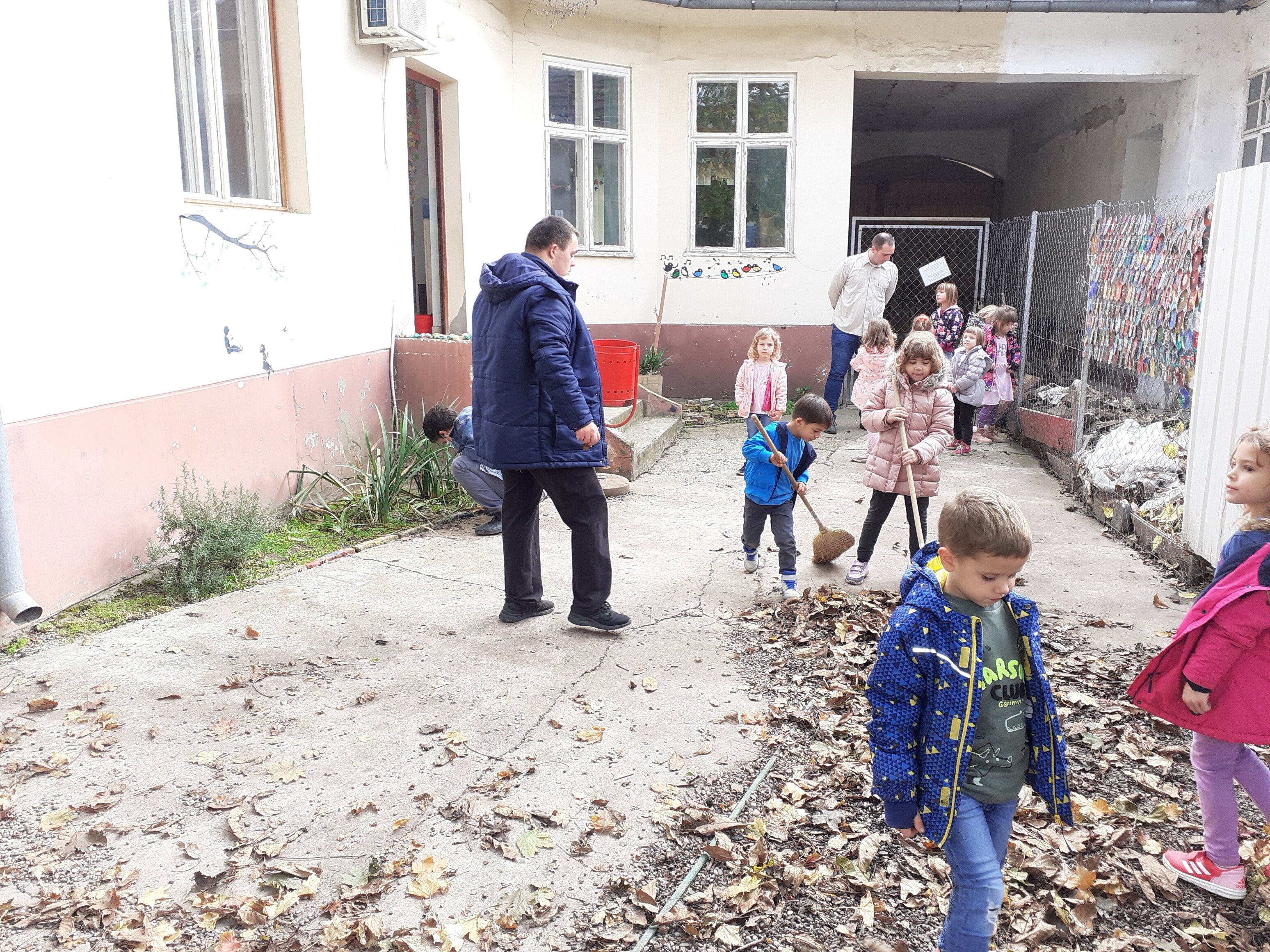 Az udvaron való tartózkodásunk alkalmával a gyerekek felfigyeltek arra, hogy a mellettünk lévő „Napközis Otthon“ épülete előtt az ott tartózkodók gereblyézik a lehullott száraz faleveleket, sepregetik a bejáratukat. A „Törpikék“ csoportja csatlakozott hozzájuk és örömmel segítettek sepregetni, levelet gyűjteni.