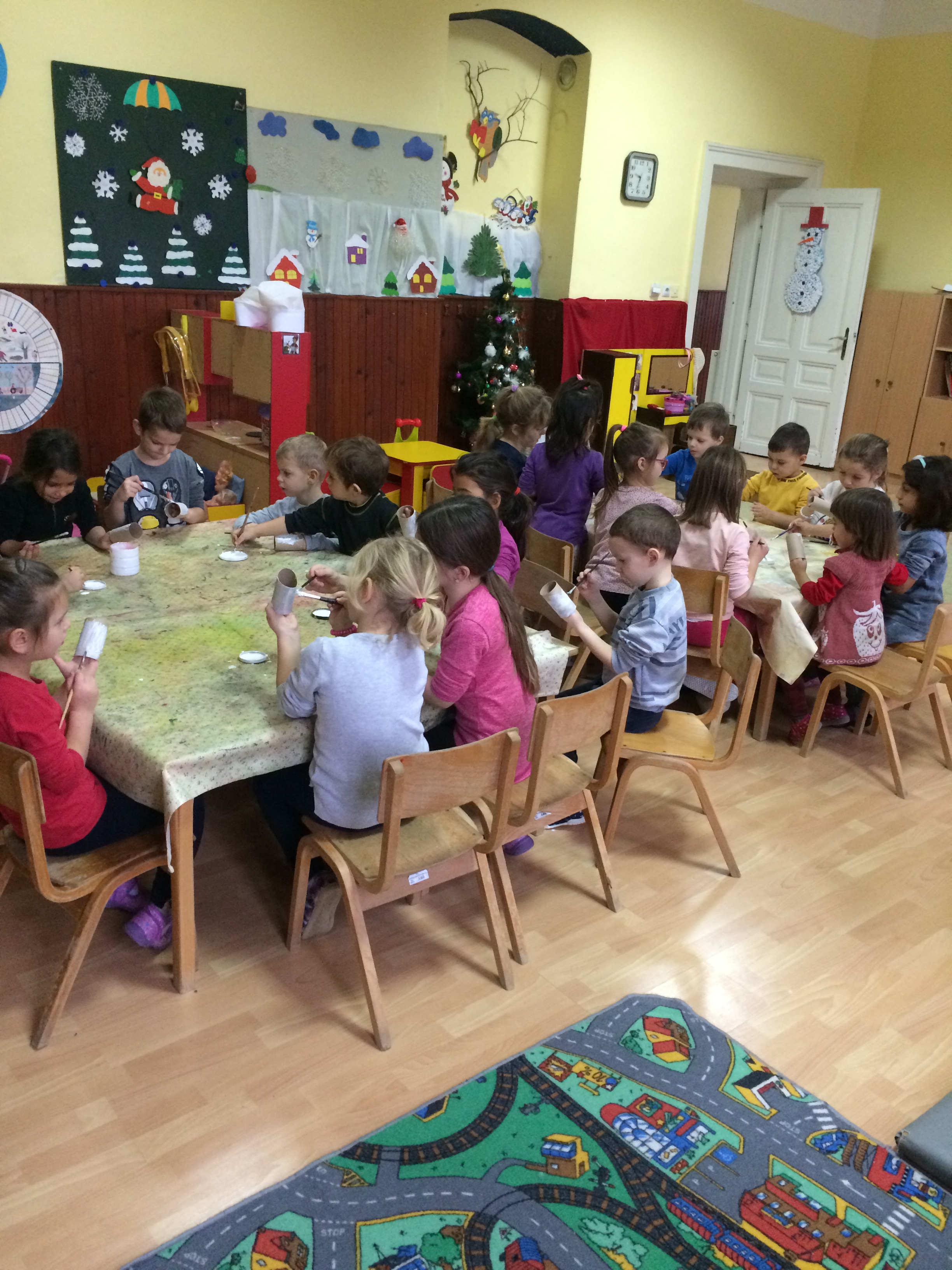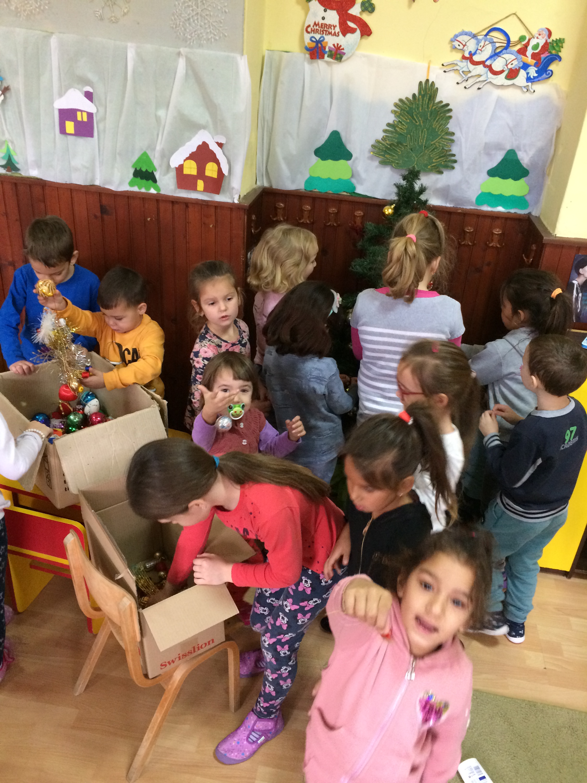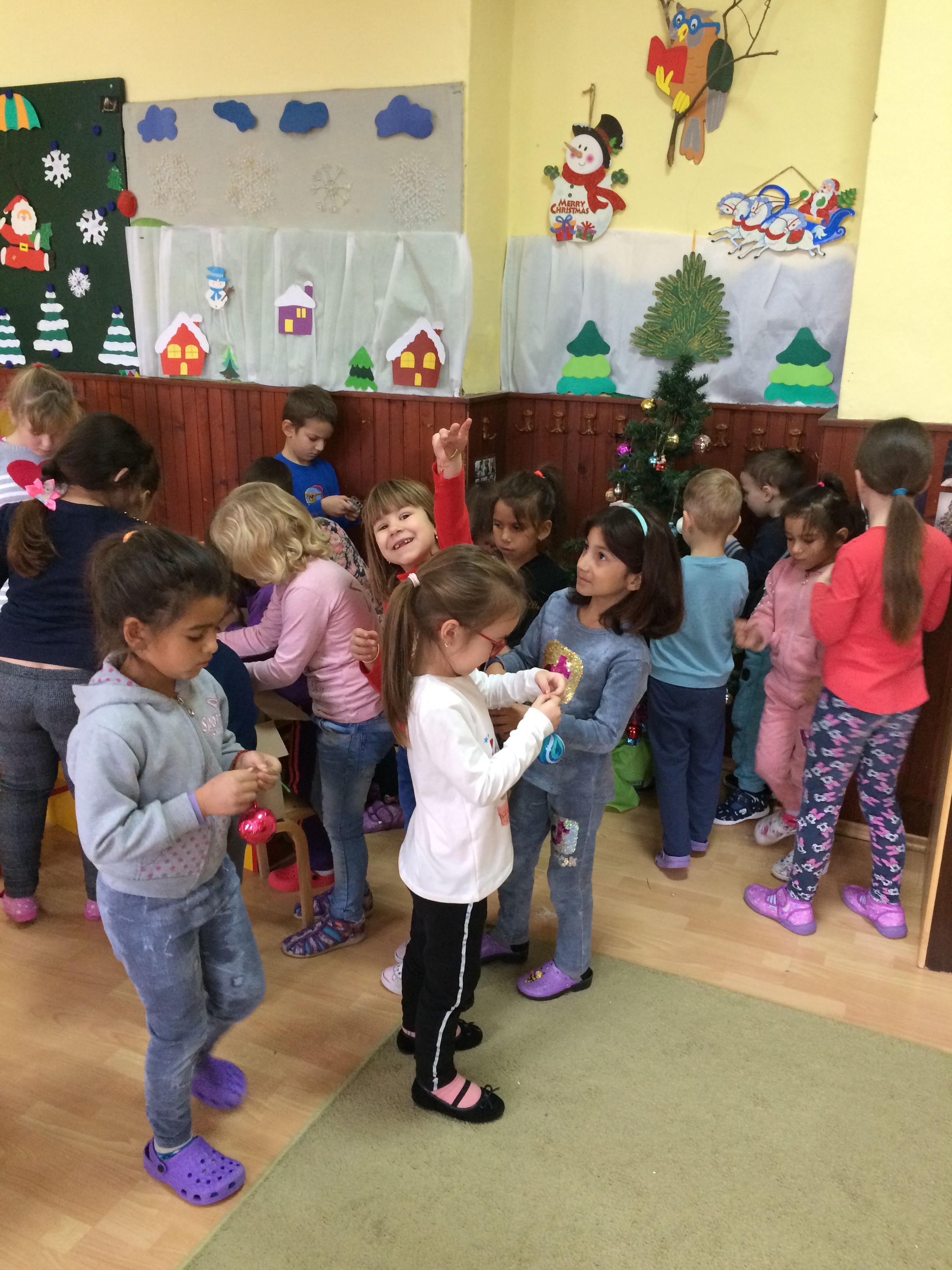 Деца из вртића „Чаролија“ украшавали су своју собу и китили јелку, певали и плесали уз новогодишње песмице, цртали Деда Мраза, јелку, правили снешка од картона…